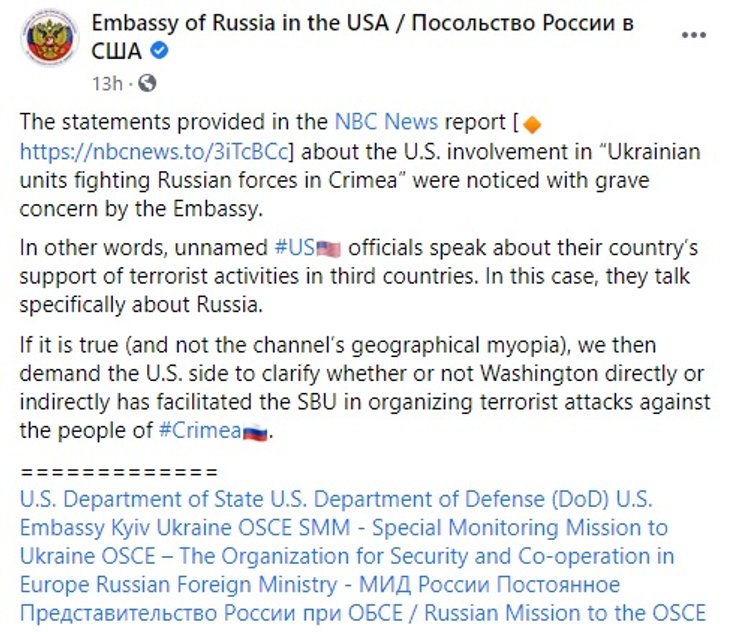 Посольство России в США высказало возмущение материалом американского телеканала NBC News, в котором в частности упоминается, что "США вооружали украинские подразделения, противостоящие российским силам в Крыму". Соответствующее заявление опубликовано на странице посольства в Facebook.