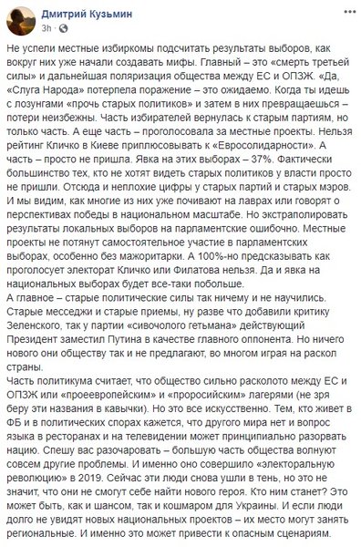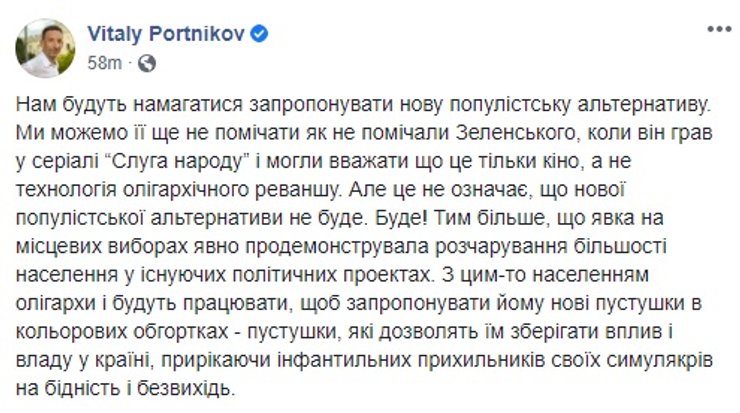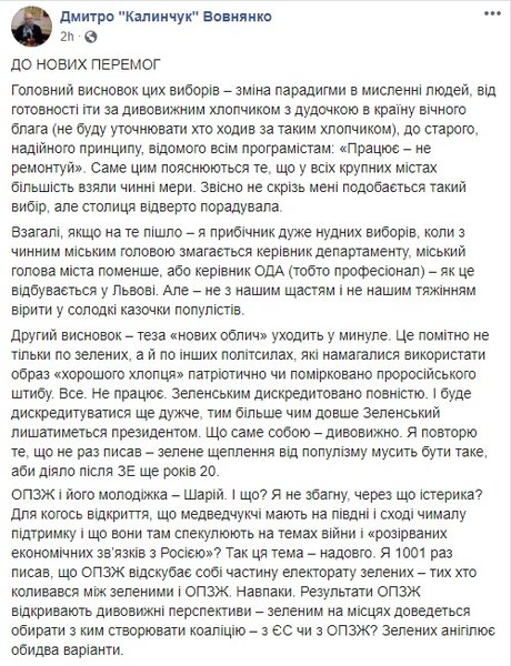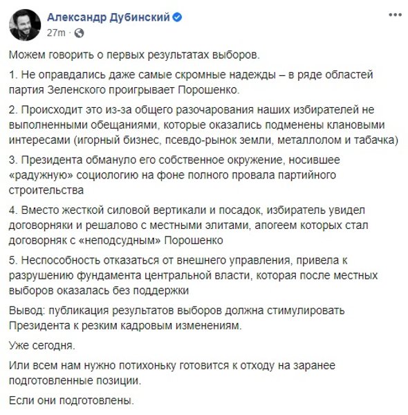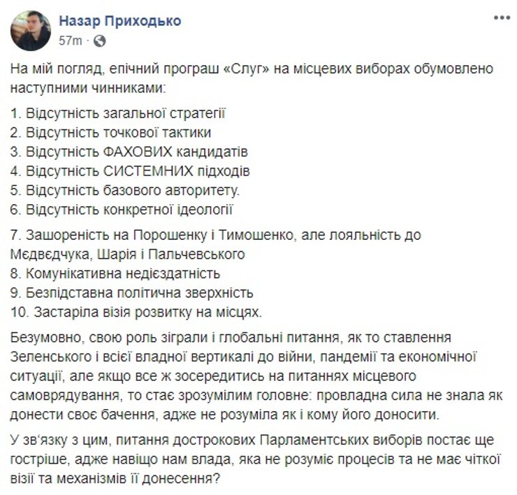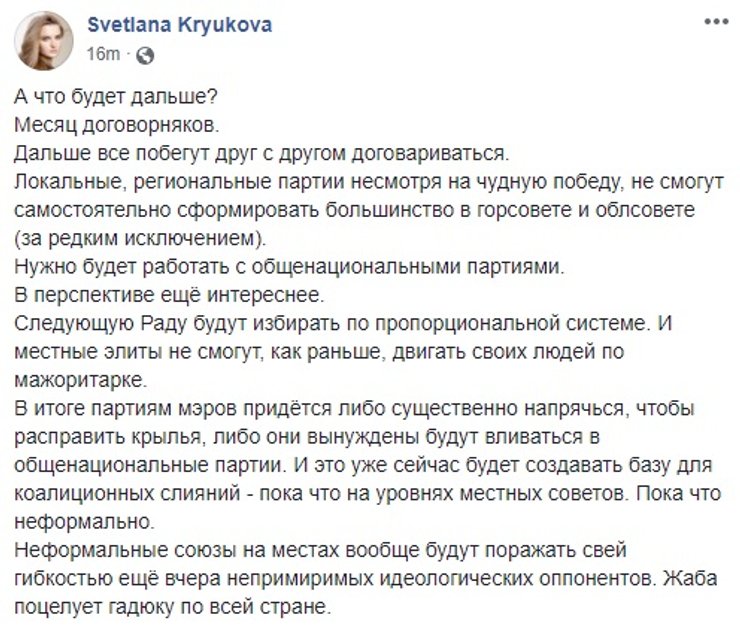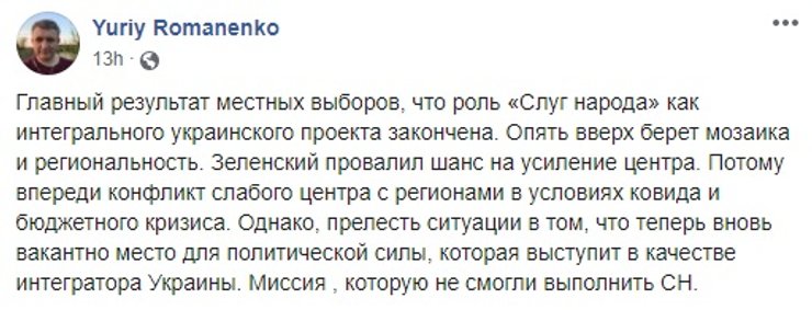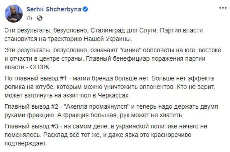 Что в сухом остатке. Все обсуждения и мнения, высказываемые по соцсетям и в ток-шоу, демонстрируют лишь часть прогнозов на будущее Украины, которые как могут воплотиться в жизнь, так и остаться только в качестве предположений. Для начала стоит дождаться стопроцентных результатов местных выборов, а потом подождать некоторое время, наблюдая за тем, что меняется, или остается постоянным в стране. Роль президента тут также важна, потому что апокалиптические вести о том, что он и его команда больше не самые популярная партия в Украине целиком подтверждаются. И если Владимир Зеленский, и правда, не начнет делать обещанное и не перестанет приукрашать успехи своей команды, то страну ждут проблемы. Или состояние ожидания проблем, но не будет никакого прогресса в позитивную сторону. Хуже, если начнется регресс, на фоне мелких неурядиц между партиями и дележе сфер влияния.