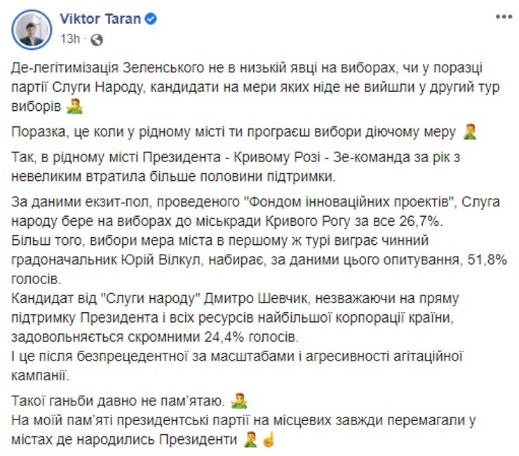 Одной из самых популярных тем для обсуждения нынче является катастрофически низкий результат "Слуг народа" и Ирины Верещук в частности. Живенькая и молодежная предвыборная кампания, показавшая "пани-мэр" в образе Мэри Поппинс, не сработала. Не удалось "слугам" и показать достойный результат даже в Кривом Роге, на родине действующего президента. Но Председатель партии "Слуга народа" Александр Корниенко заявил, что не считает местные выборы 2020 провалом для монобольшинства. По его словам, это был "праздник демократии".
