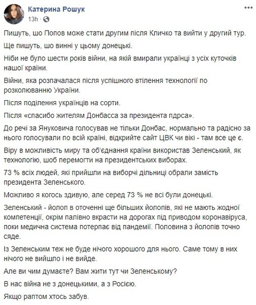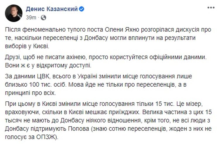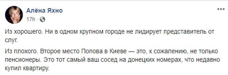На фоне неплохих результатов ОПЗЖ появилась еще одна тема для обсуждения, мол, это "понаехавшие" испортили Киеву избирательную картинку, продвинув Александра Попова мимо Сергея Притулы, Алексея Кучеренко и Ирины Верещук. Причем высказана подобная идея была весьма агрессивно и вызвала не менее агрессивную "ответку". Оппоненты данной идеи отметили, что снова выискивать врагов среди народа Украины и корить их за их выбор - путь, обреченный на провал, и объединению страны он никак не способствует.