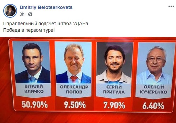 А пока этого не случилось, гражданам Украины придется удовлетворяться результатами экзит-полов. И по этим данным, которые постоянно меняются, потому что подсчет голосов все еще продолжается, действующий градоначальник Виталий Кличко побеждает в один тур. Правда, недоверие вызывает тот факт, что данные эти предоставил его помощник. На втором месте Александр Попов, тройку замыкает Сергей Притула.