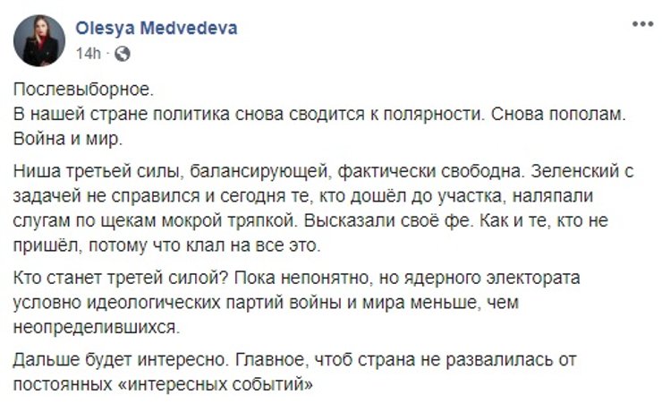 Некоторые высказались, что в сложившейся ситуации, когда у власти снова скорей всего окажутся противоборствующие и настраивающие народ против друг друга силы, теперь снова вакантно место третьей силы: балансирующей, примиряющей. "Слуги народа", которые пытались ей стать, набрав разношерстую компанию в свою команду, с данной миссией не справились - у власти все равно оказались давно закаленные в политических боях товарищи. И место оказалось вакантно. Впрочем, бытует мнение, что та самая таинственная "третья сила" может стать для Украины вовсе не спасением и не принесет долгожданный мир, а совсем напротив - утащит страну в полнейший хаос, на фоне которого все происходящее до 2020 года покажется незначительным.