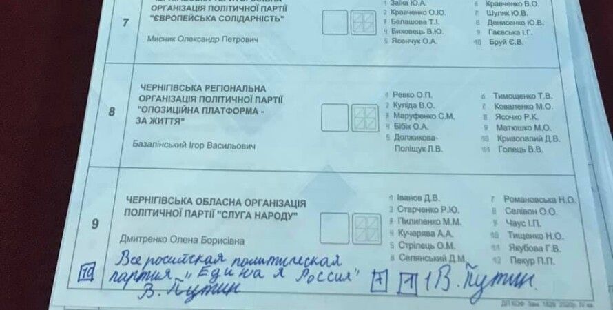 В Чернигове избиратель испортил бюллетень, дописав в него партию "Единая Россия" и фамилию российского президента Владимира Путина. Об этом сообщил кандидат в депутаты Черниговского городского совета Игорь Полуян на своей странице в Facebook.