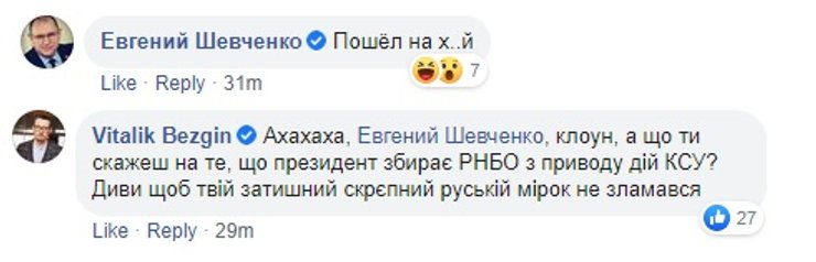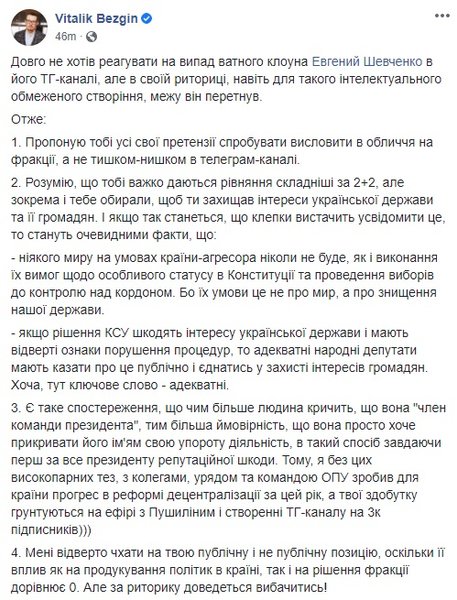 Безгин в долгу не остался и тоже написал пост, в котором обозвал Шевченко "ватным клоуном" и призвал высказывать свое мнение в лицо, а не "втихаря" по Telegram-каналам.