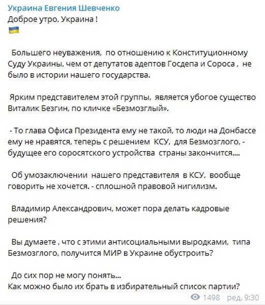 Данное решение вызвало многочисленные дискуссии, но одна из самых ярких развернулась между двумя нардепами от "Слуги народа". Евгений Шевченко, который уже давно ведет Telegram-канал, в котором беззастенчиво "сливает" информацию о внутрепартийных переговорах, написал пост, в котором он выступил против своего однопартийца Виталия Безгина и обозвал его "безмозглым" и "соросенком".