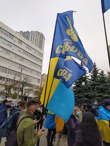 Среди протестующих немало представителей партии "Свобода" и Национального корпуса.
