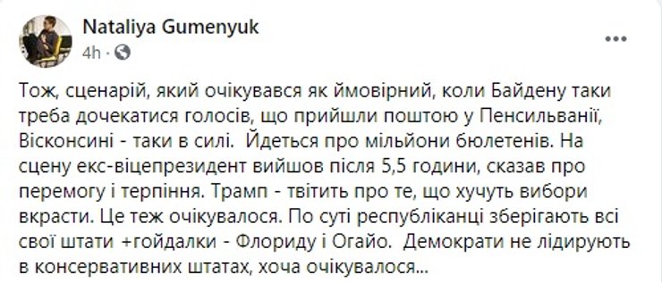 Илья Куса, эксперт по международной политике аналитического центра "Украинский институт будущего" считает, что интрига сохранится из-за особенностей выборного процесса 2020 года. Голоса тех американцев, что голосовали почтой, еще не подсчитали. А это 40% от общего числа избирателей, и является историческим рекордом. "Трамп через суд обязал подсчитать их в турборежиме за 3 дня. Это 100 млн. голосов, которые могут изменить ситуацию в ключевых штатах, учитывая маленький разрыв между кандидатами. Есть риск, что кто-то захочет объявить о своей победе раньше официальных результатов. Не исключаю и споров по поводу результатов голосования в отдельных округах", — говорит эксперт.