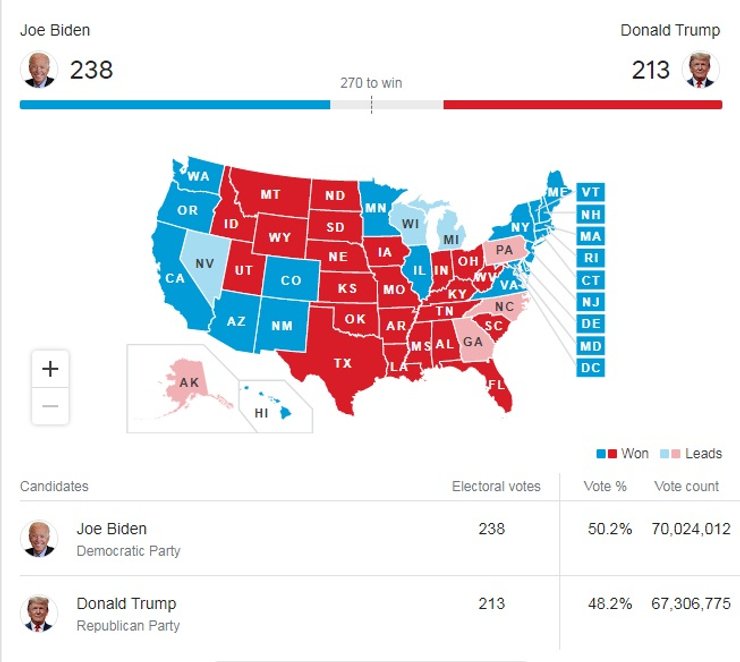 По предварительным данным, за действующего главу США Дональда Трампа свои голоса отдали 48.2% американцев. Он получил 213 голосов выборщиков. Джо Байдена поддержали 50.2% американцев. К настоящему времени он набирает 238 голоса выборщиков.