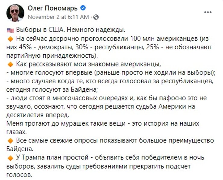 Обозреватель-международник Александр Юсупов напоминает, что одна из ведущих американских аналитических компаний Hawkfish ранее заявляла, что Трамп очень вероятно победит с большим перевесом в первый день подсчета голосов, но в конечном итоге проигрывает, когда все голоса будут подсчитаны, потому сторонники Байдена голосовали по почте более активно. А значит, есть риск того, что Трамп может преждевременно объявить о своей победе, а потом откажется признавать поражение, которое может быстро столкнуть лбами его радикальных сторонников и оппонентов.