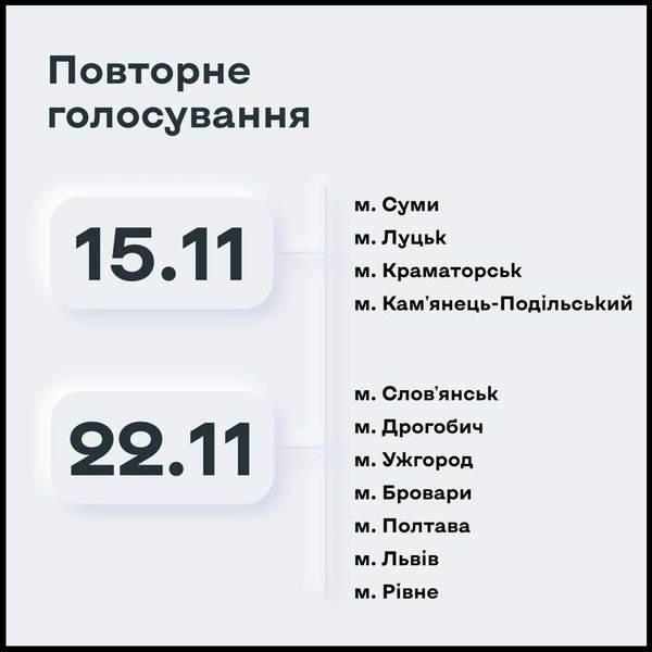 Как указано в сообщении Центризбиркома Украины, 15 ноября второй тур мэрских выборов состоится в Луцке, Краматорске, Каменце-Подольском, а также в Сумах.