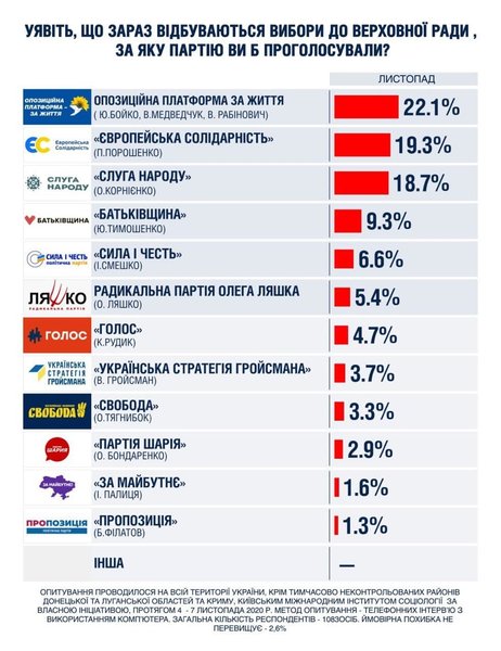 Опрос проводился на всей территории Украины, кроме временно неконтролируемых районов Донецкой и Луганской областей и Крыма, Киевским международным институтом социологии по собственной инициативе, в течение 17-24 октября 2020 Метод опроса — телефонных интервью с использованием компьютера. Общее количество респондентов — 1502 человек. Вероятная погрешность — 2,6%