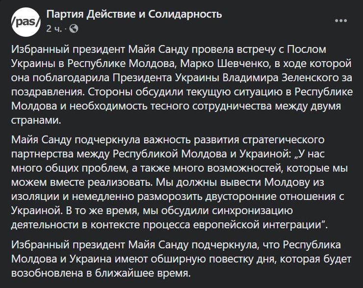 Новоизбранный президент Республики Молдова Майя Санду встретилась с послом Украины в Молдове Марко Шевченко и высказалась в пользу разморозки двусторонних отношений с Украиной.