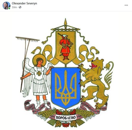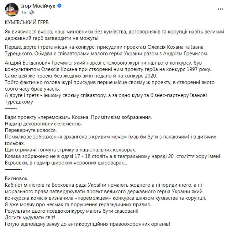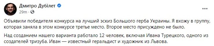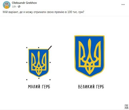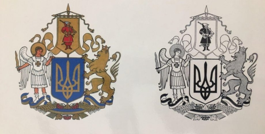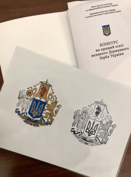 "Первую премию получил проект Алексея Кохана. Эскиз-победитель содержит обязательные элементы для большого Государственного герба, в частности: герб Войска Запорожского, воина-козака, рыцаря с мушкетом и знака Княжеского государства Владимира Великого, то есть малый Государственный герб", — говорится в сообщении от министра.