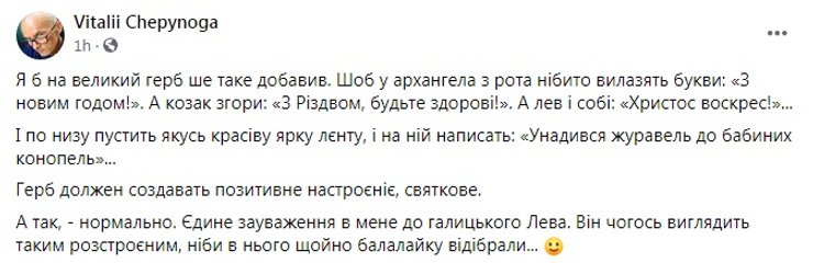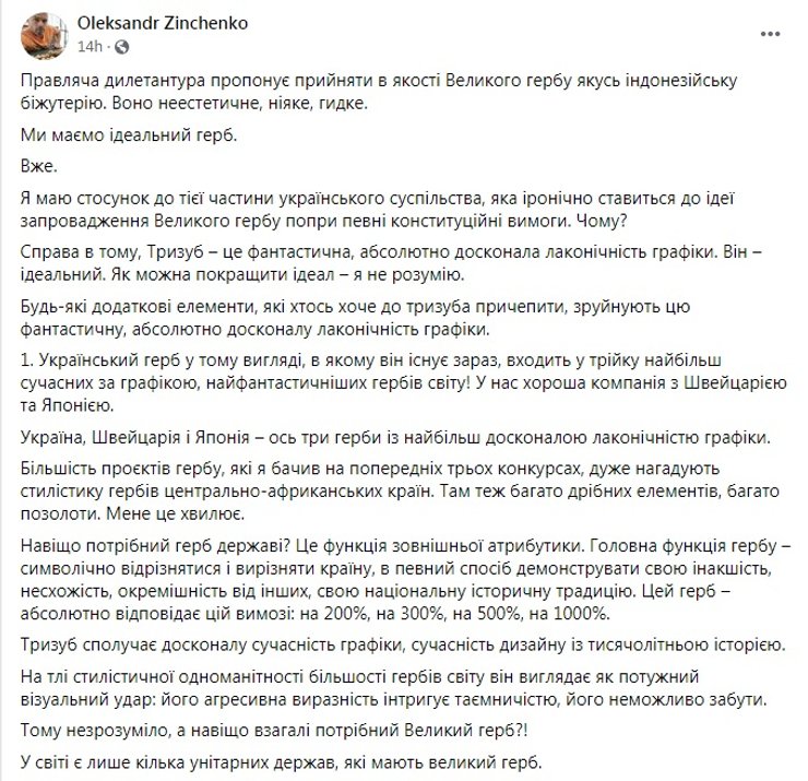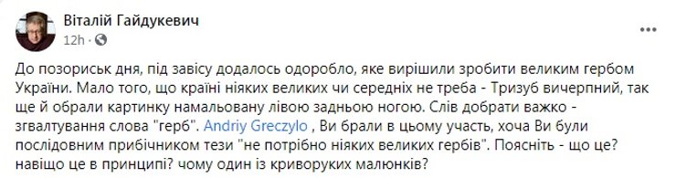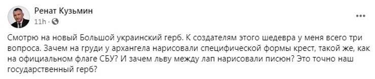 Дубилет задался вопросом, а нужен ли вообще большой герб, а если нужен, то должны ли там присутствовать религиозные символы, если Украина — светская держава.