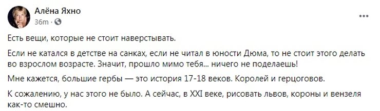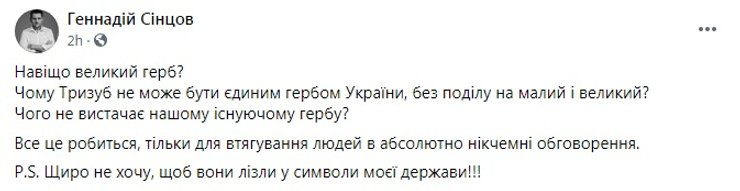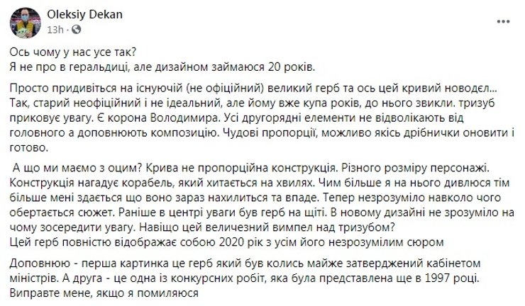 Эскиз-победитель вызвал в соцсетях недоумение. По мнению критиков, сама идея с большим Государственным гербом довольно архаична и он в принципе не нужен. Особенно когда украинский герб настолько узнаваем и лаконичен. Причем говорил об этом и сам Андрей Гречило, член жюри еще в 2013 году. "Нынешний украинский герб апеллирует к идее соборности. Тризуб был утвержден еще в 1918 году, он несет идею объединения украинских земель, апеллируя к наследию Киевской Руси. Для Украины большой герб как таковой не нужен", — говорил Гречило. Ему вторил и первый президент незвисимой Украины Леонид Кравчук. "Было бы очень хорошо еще тогда узаконить большой герб. Однако этого не произошло, время упущено", — отмечал первый президент.