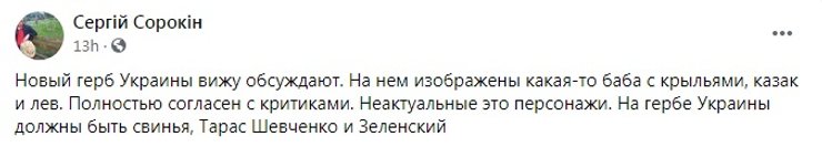 Впрочем, согласно Конституции, на большом гербе должны обязательно присутствовать два элемента: малый государственный герб (это нынешней тризуб) и элементы герба Войска Запорожского, на котором изображен козак с мушкетом. Это несколько ограничивает фантазию.