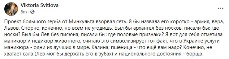 Но если уже представить, что Украине без большого Государственного герба никак, то почему выбор "авторитетного" жюри пал именно на представленный вариант? Неужели среди 112 работ не нашлось чего-то более современного, элегантного и лучше нарисованного, — вопросили в соцсетях и поинтересовались, почему на эскизе-победителе имеются такие детали, как гениталии у льва и игривые носочки у архангела, который больше похож на девушку.