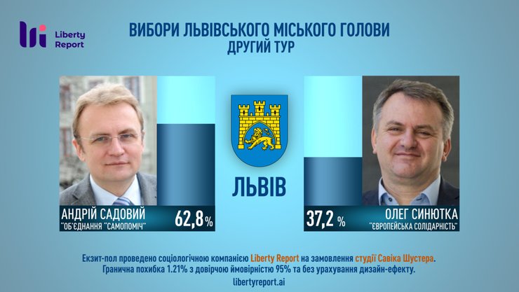 По данным компании Liberty Report, нынешний мэр Львова во втором туре набирает 62,8% голосов, а его конкурент, народный депутат от "Европейской солидарности" Олег Синютка – 37,2%.