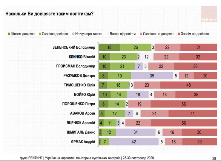 Согласно результатам соцопроса группы Рейтинг, проведенного 28-30 ноября, в лидерах по уровню доверия среди украинских политиков оказались президент Владимир Зеленский (44% доверяют, 53% не доверяют), мэр Киева Виталий Кличко (33% и 54%) и бывший премьер-министр Украины Владимир Гройсман (31% и 58%).