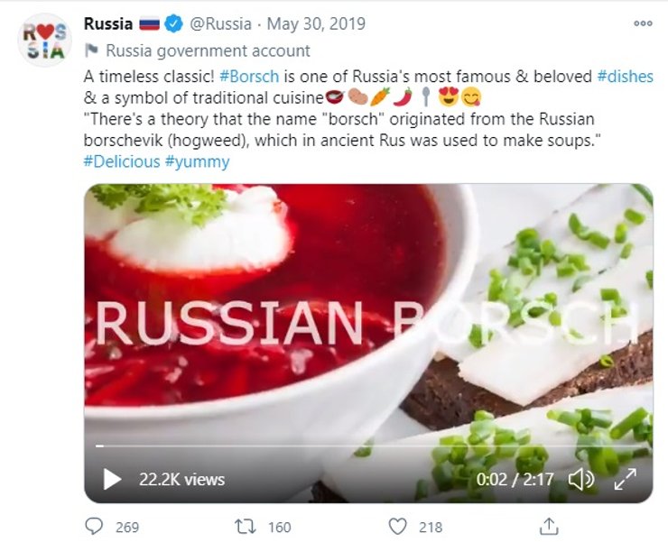 Это не первый подобный скандал. В прошлом году в соцсетях МИД РФ появился видеорецепт, посвященный "русскому борщу", но бурных дискуссий на тысячи комментариев он не вызвал.