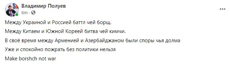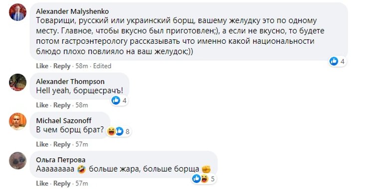 Комментарии поделились на несколько категорий – часть, чаще всего украинских, отмечали, что борщ – это блюдо национальной украинской кухни, а под национальным русским блюдом все же являются щи, часть – радовалась тому, что "борщ аннексирован, как и Крым", а некоторые посчитали, что борщ – это некая объединяющая сила, которые свидетельствует о том, что все славяне одинаковые и связывают их братские чувства.