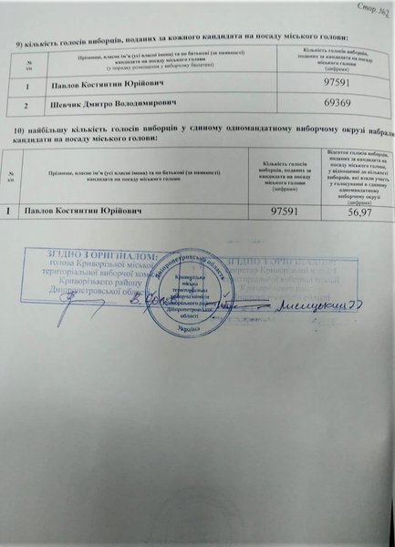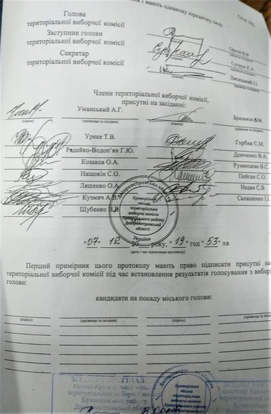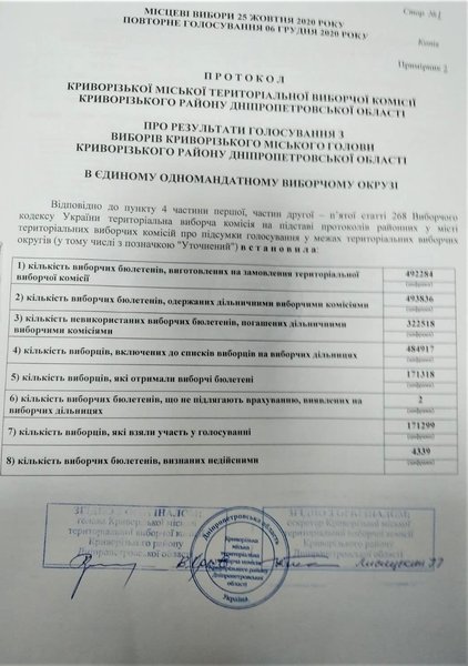 Вечером в понедельник, 7 декабря Криворожская городская территориальная избирательная комиссия опубликовала протоколы с мокрыми печатями, которыми установлен результат повторного голосования на выборах городского головы.