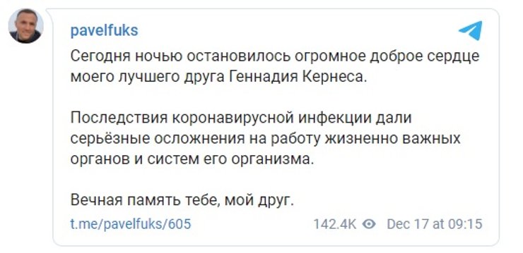 О том, что Геннадий Кернес скончался, первым сообщил его близкий друг Павел Фукс, который находился с ним в клинике Шарите.
