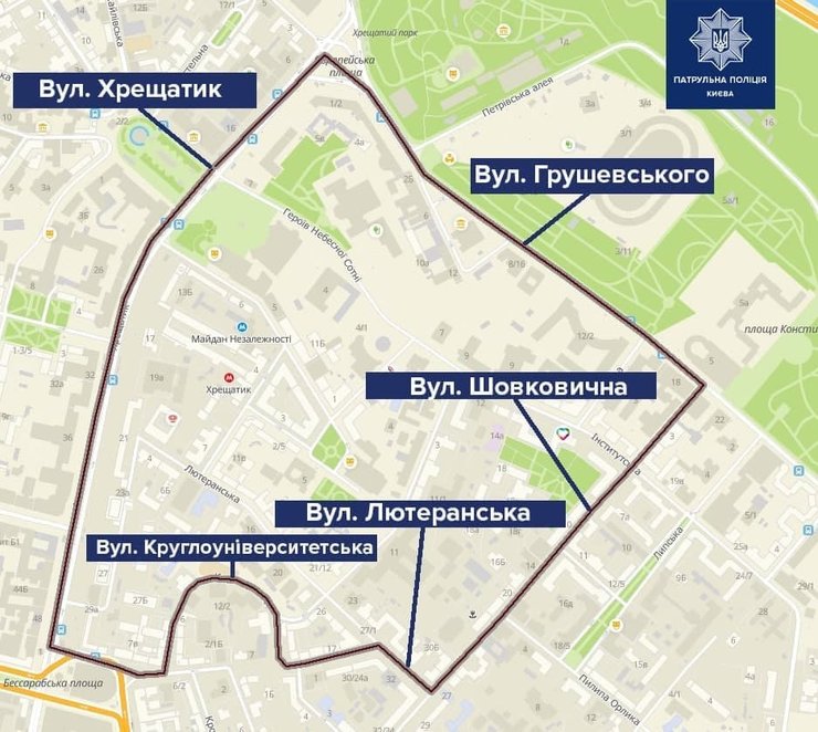 "В связи с проведением массового мероприятия 22 декабря на некоторых улицах столицы будет временно ограничено движение транспортных средств. Планируемый маршрут: Майдан Незалежности – улица Крещатик – Бессарабская площадь – улица Круглоуниверситетская – улица Лютеранская – улица Шелковичная – улица Михаила Грушевского – Европейская площадь – Майдан Незалежности", – сообщила в Telegram патрульная полиция Киева и опубликовала карту-схему перекрытия.