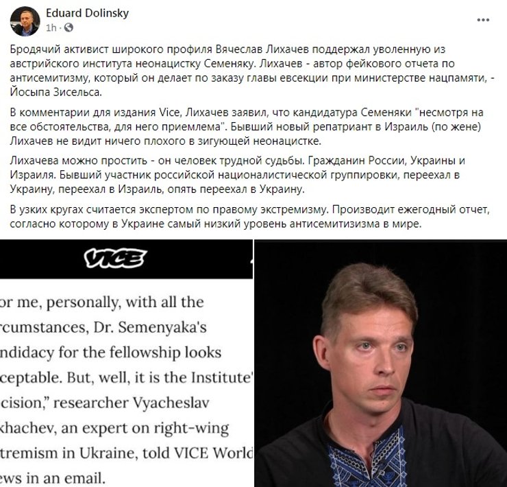 Долинский утверждает, что именно Лихачев публикует ежегодный отчет, согласно которому в Украине самый низкий уровень антисемитизизма в мире, что не соответствует действительности.