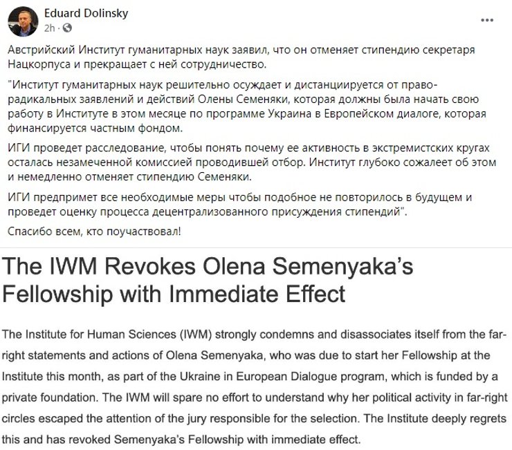 "Институт гуманитарных наук решительно осуждает и дистанциируется от право-радикальных заявлений и действий Олены Семеняки, которая должны была начать свою работу в Институте в этом месяце по программе Украина в Европейском диалоге, которая финансируется частным фондом. Институт проведет расследование, чтобы понять почему ее активность в экстремистских кругах осталась незамеченной комиссией проводившей отбор. Институт глубоко сожалеет об этом и немедленно отменяет стипендию Семеняки", — написал Долинский.