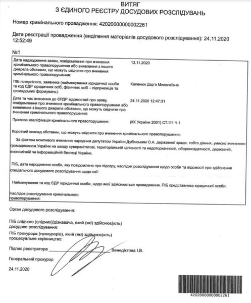 8 декабря прошлого года ЦПК проинформировал украинцев о том, что против этого же депутата было возбуждено уголовное дело по ч.1 статьи 111 УК (Государственная измена), а также опубликовал копию решения из Единого реестра досудебных расследований.