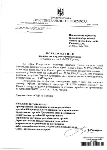 Офис Генпрокурора после обращений Центра противодействия коррупции открыл против народного депутата от партии "Слуга народа" Александра Дубинского уголовные производства по двум статьям. Об этом сообщается на странице ЦПК в социальной сети Facebook.