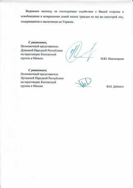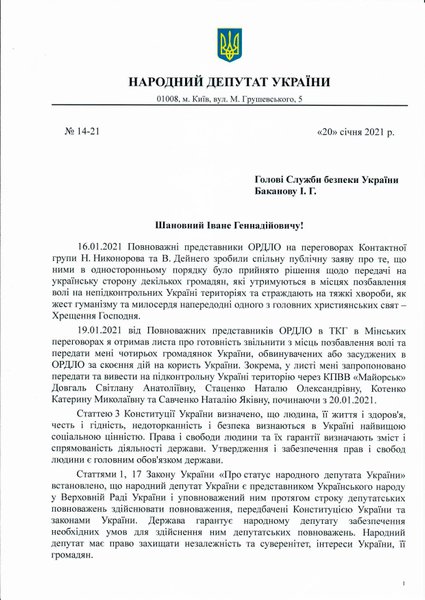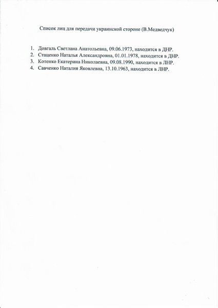 В письме Медведчуку предлагается вывести на подконтрольную Украине территорию через КПВВ "Майорск" граждан Украины: Довгаль Светлану Анатольевну, Стаценко Наталью Александровну, Котенко Екатерину Николаевну и Савченко Наталью Яковлевну. Осуществить это можно начиная с 20 января 2021 года.