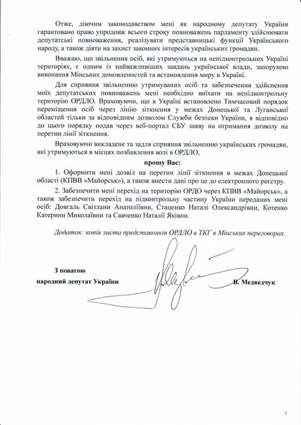 Виктор Медведчук проинформировал, что к нему обратились с официальным письмом полномочные представители ОРДО Н. Ю. Никонорова и ОРЛО В. Н. Дейнего.
