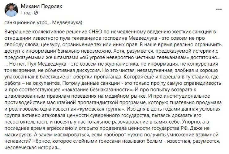 В подобном же ключе, только более многословно высказался и Михаил Подоляк, советник главы Офиса президента. Он заявил, что данное решение "прозрачное, мотивированное и направленное на противодействие фейкам и чужеродной пропаганде".