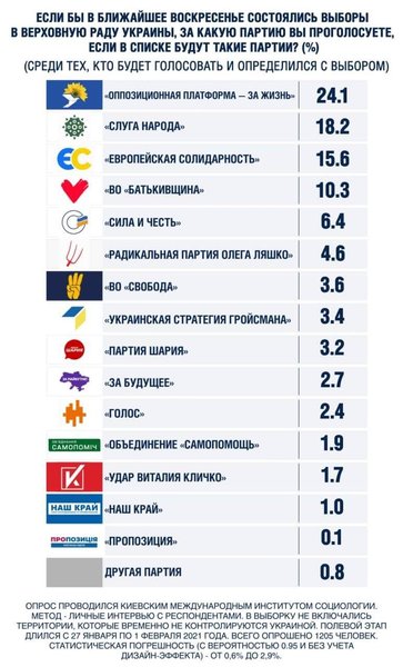 Если бы выборы в Верховную Раду Украины состоялись в ближайшее воскресенье, то большинство голосов получила бы партия "Оппозиционная платформа — За жизнь". Об этом свидетельствуют результаты опроса, проведенного Киевским Международным Институтом Социологии (КМИС).