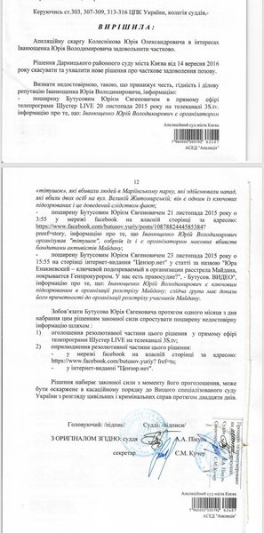"Со стороны господина Бутусова видим очередную попытку очернить имя Юрия Иванющенко. Еще 18 января 2017 года Апелляционный суд города Киева удовлетворил исковые требования господина Иванющенко к Бутусову о защите чести достоинства и деловой репутации, а также обязал опровергнуть недостоверную информацию, озвученную им в телеэфире, на своей странице в Facebook, а также на сайте "Цензор". Речь как раз об этом фейке, который Бутусов снова распространяет. Это решение суда набрало силу, но было проигнорировано Бутусовым", — заявил Юрий Колесников.
