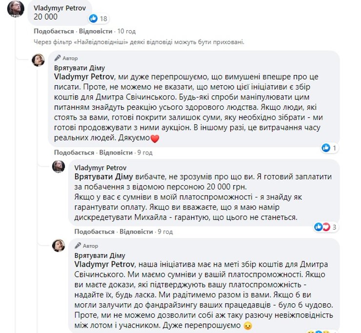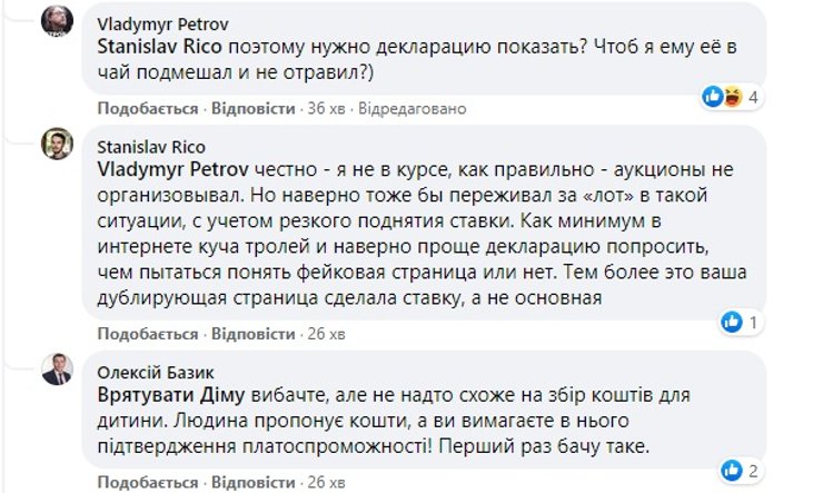 Они напомнили, что на "любые попытки манипулировать вопросом с аукционом" отреагирует "все здоровое человечество". И отметили, что, если "люди, которые стоят за вами (Владимиром Петровым – ред.), готовы покрыть остаток суммы, которую необходимо собрать — мы готовы продолжать с ними аукцион. В противном случае, это трата времени реальных людей".