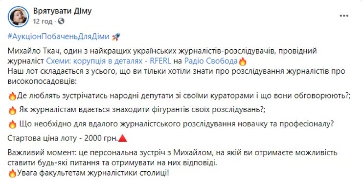 Одним из лотов выступила встреча и беседа с Михаилом Ткачом, журналистом программы "Схемы: коррупция в деталях – RFERL" на "Радио Свобода" со стартовой ценой в 2000 гривен.