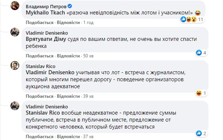 Лотом выступала встреча с Михаилом Ткачом, журналистом программы "Схемы: коррупция в деталях – RFERL", цена нее стартовала с 2 тысяч гривен, Петров сделал ставку в 30 тысяч.