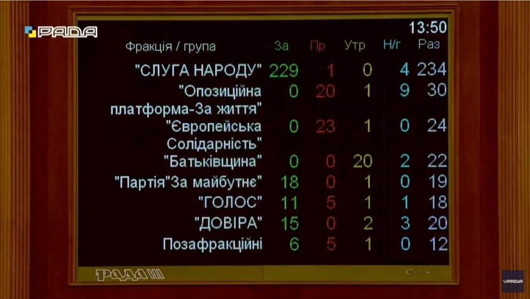 "За" законопроект проголосовали 279 народных депутатов, из которых 229 — представители "Слуги народа", 18 — группы "За майбутнє", 15 — "Доверия", 11 — "Голоса" и 6 внефракционных. Документ не поддержал ни один представитель "Евросолидарности", ОПЗЖ и "Батькивщины".