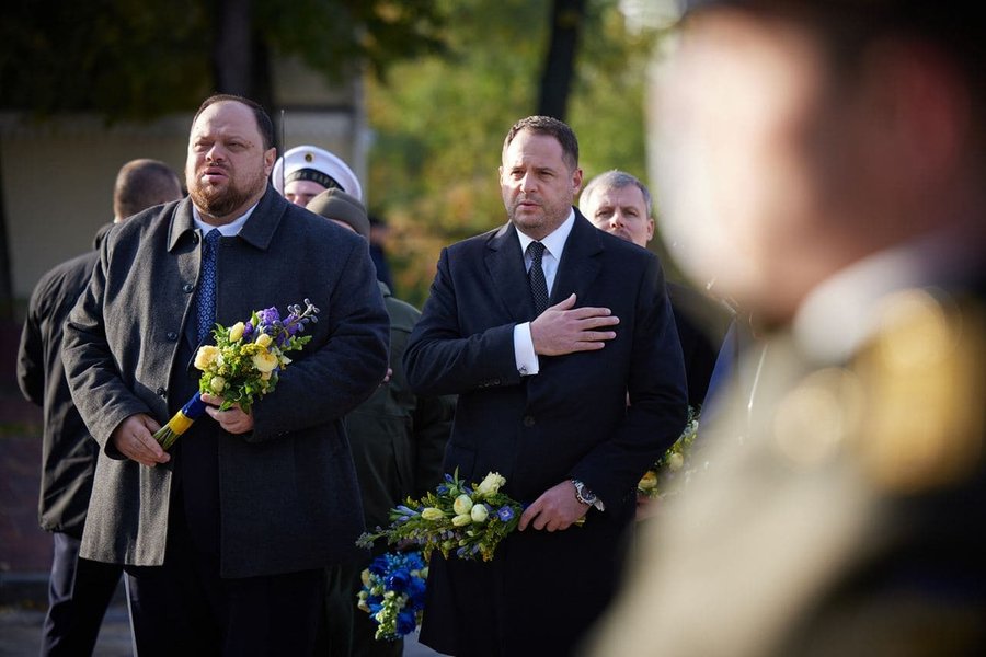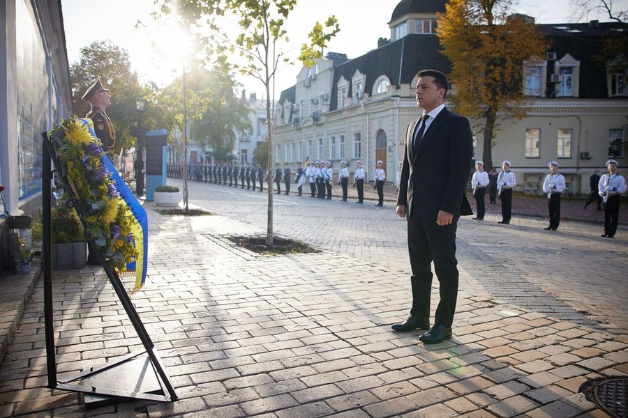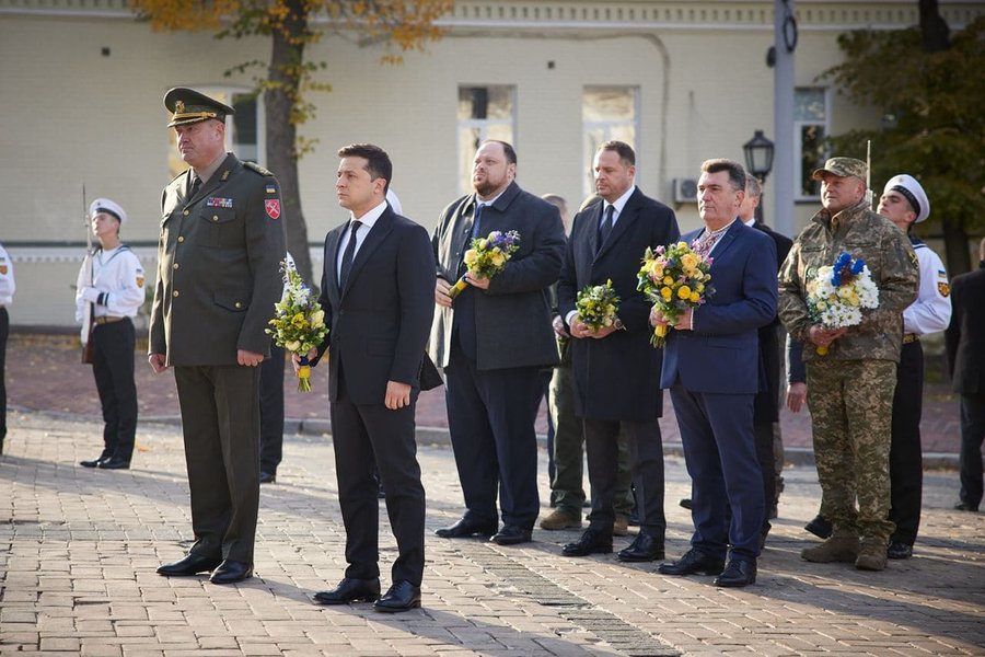 14 октября Владимир Зеленский также поучаствовал в церемонии почтения памяти погибших за Украину на Михайловской площади в Киеве. Вместе с ним прибыли спикер Верховной Рады Руслан Стефанчук, глава ОП Андрей Ермак и секретарь СНБО Алексей Данилов.