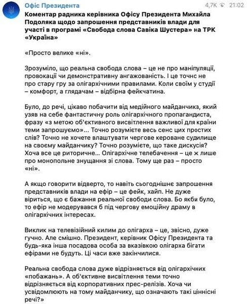 Как объяснил советник главы ОП Подоляк, такое решение обусловлено олигархичностью телеканала и его заангажированностью.