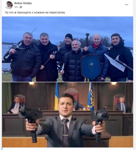 Еще на одной фотографии команду противопоставили Зеленскому. "Ну кто же приходит с ножами на перестрелку?", – спрашивает пользователь Anton Hodza.