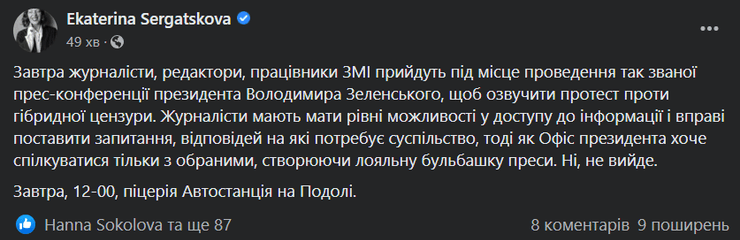 "Завтра журналисты, редактора и сотрудники СМИ придут под место проведения так называемой пресс-конференции президента Владимира Зеленского, чтобы озвучить протест против гибридной цензуры", — сообщила Сергацкова.