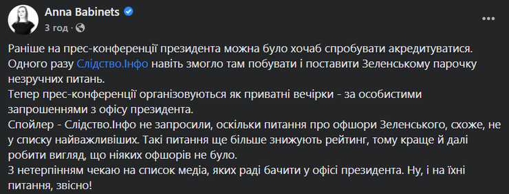 "Ранее на пресс-конференции президента можно было хотя бы попытаться аккредитоваться. Однажды "Слідство.Інфо" даже смогло там побывать и задать Зеленскому парочку неудобных вопросов. Теперь пресс-конференции организуются как частные вечеринки — по личным приглашениям из Офиса президента", — написала главред агентства.
