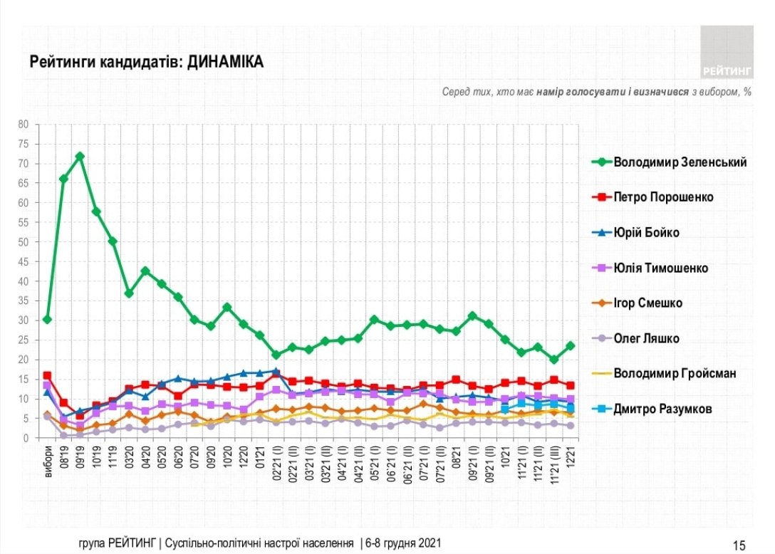 По сравнению с предыдущим опросом, проведенным с 10 по 13 ноября, уровень поддержки Зеленского в декабре вырос на 0,4 процентных пункта. Что касается Порошенко, то у него этот показатель поднялся на 0,1 п.п. А у замыкающей тройку лидеров Тимошенко поддержка избирателей снизилась на 0,8 п.п.