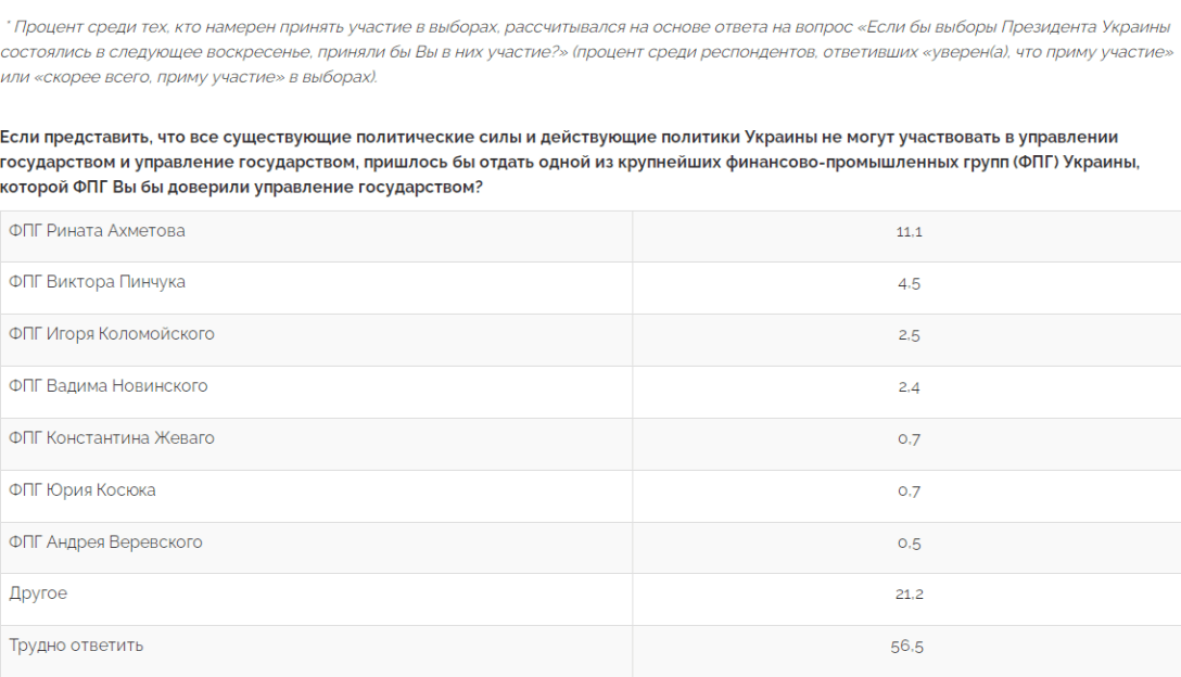 Только 22% опрошенных готовы доверить управление страной крупнейшей финансово-промышленной группе (ФПГ). Из них половина (11%) доверила бы ФПГ бизнесмена Рината Ахметова, 4,5% – Виктора Пинчука, 2,5% – Игоря Коломойского и 2% – Вадима Новинского. Менее всего доверяют ФПГ Константина Жеваго и Юрия Косюка (0,7%), а также ФПГ Андрея Веревского ( 0,5%).