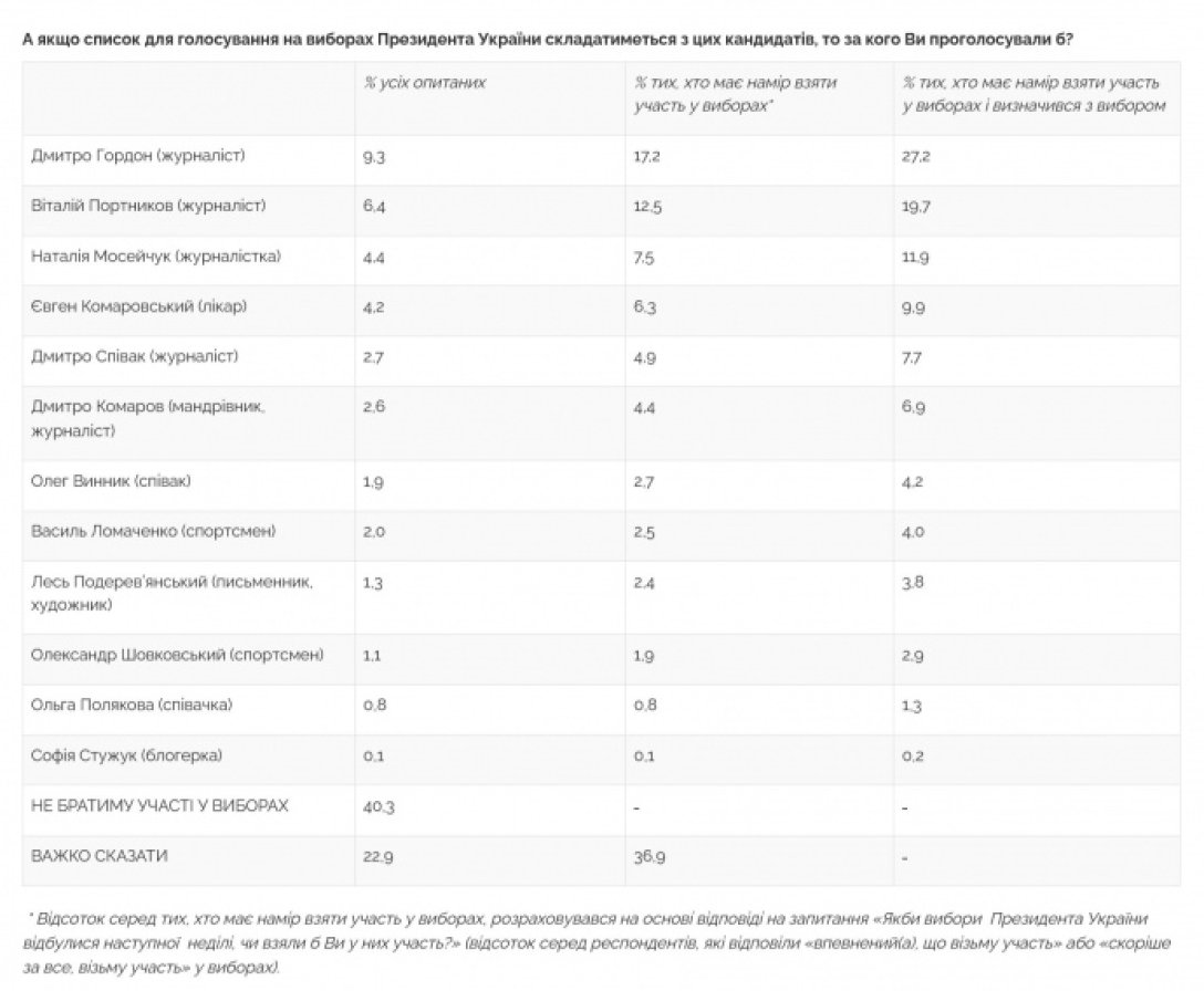 Менее 30% опрошенных готовы отдать свой голос, если в бюллетене не будет политиков. По данным соцопроса, Гордон получил больше всех голосов – 9% среди респондентов или 27% тех, кто примет участие в выборах и определился, за кого будет голосовать.