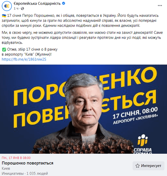 Партия "Европейская солидарность" ("ЕС") призвала сторонников главы политсилы, пятого президента Украины Петра Порошенко 17 января собраться в аэропорту "Киев" ("Жуляны") и встретить его там. Об этом сказано в объявлении партии, которое опубликовано в Facebook.